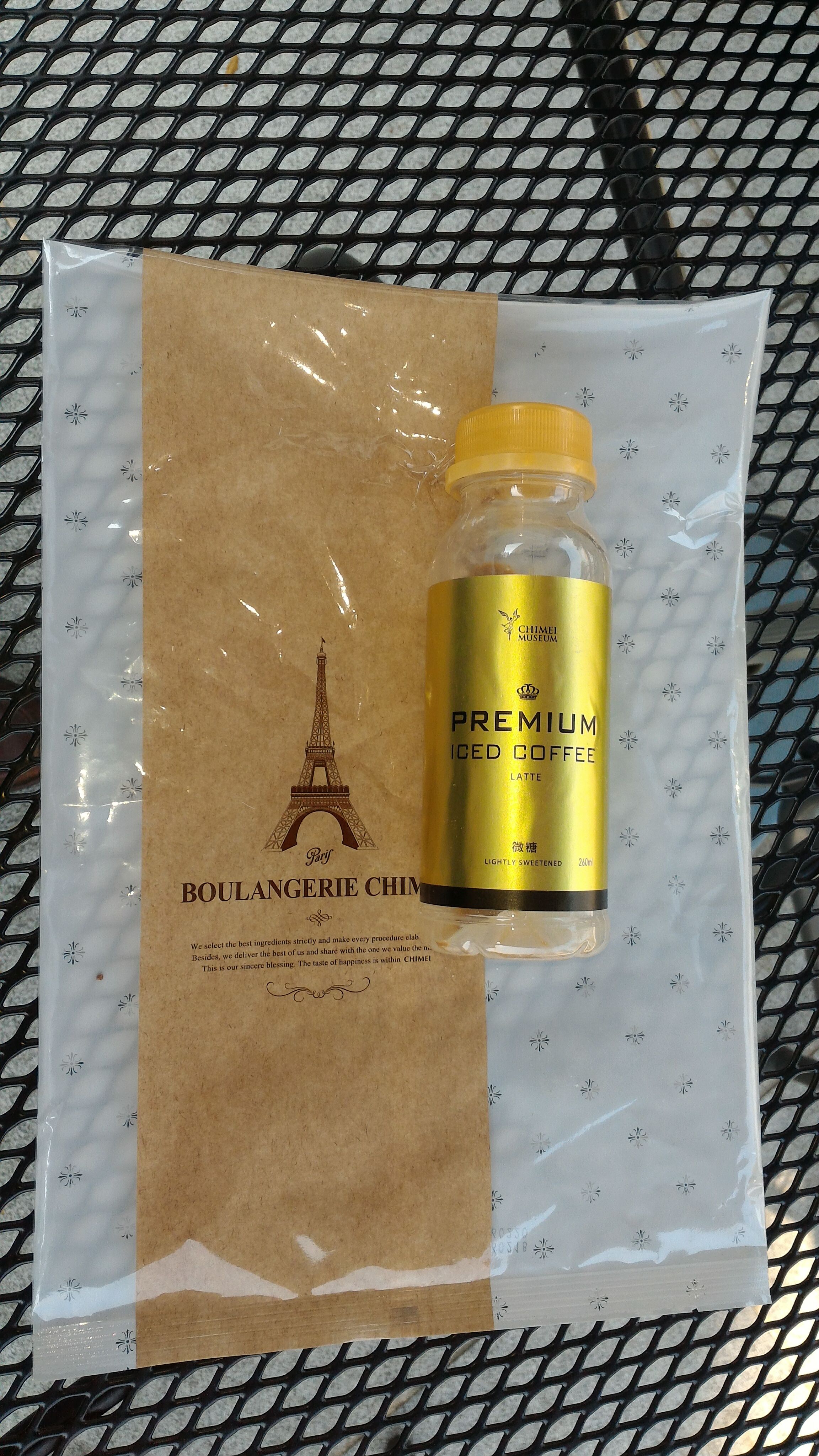 - 中庭で買ったコーヒー瓶とパンの包み